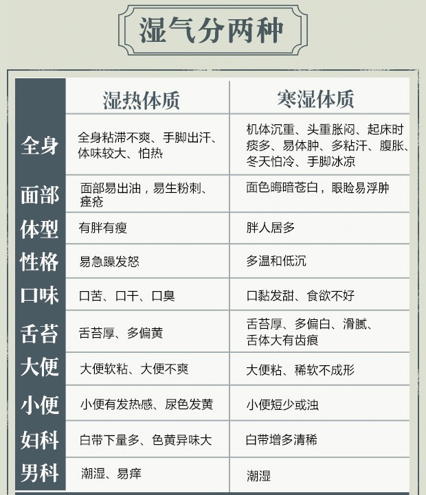 濕氣對(duì)人傷害隱蔽而緩慢,有句古話叫:“千寒易除,一濕難去。濕性黏濁,如油入面?!斌w內(nèi)有濕氣的時(shí)候,人往往表現(xiàn)出來(lái)困倦、乏力、食欲差、身體浮腫、小肚子大、裙邊舌、舌苔黃膩或頭發(fā)油膩、出汗多等情況。