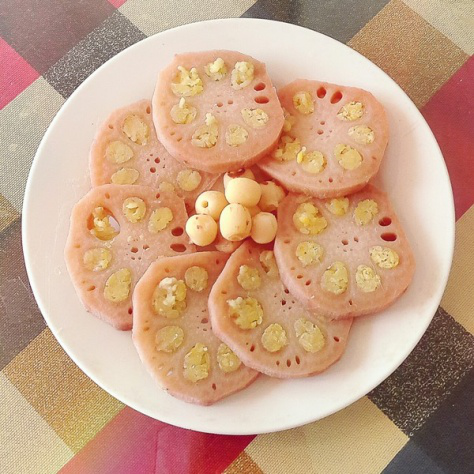 做法:藕去皮,沖洗干凈備用。綠豆50克,用清水浸泡后取出,裝入藕孔內(nèi),放入鍋中,加清水燉至熟透,調(diào)以食鹽進(jìn)食??擅髂恐箍?。