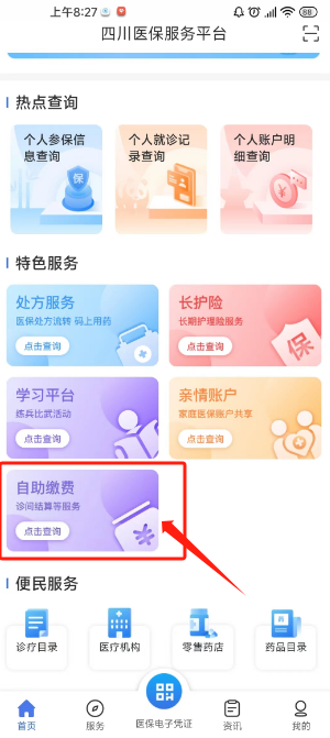 第一步打開APP,登錄后首頁下拉至特色服務(wù)【自助繳費】。