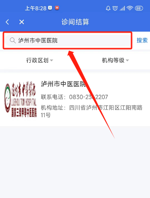 第二步在輸入醫(yī)院名稱搜索欄輸入“瀘州市中醫(yī)醫(yī)院”,點擊醫(yī)院名稱