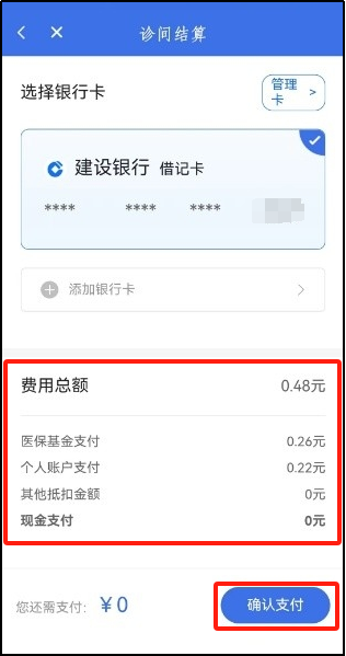 第四步點擊確認(rèn)支付,即可完成醫(yī)保統(tǒng)籌在線結(jié)算。