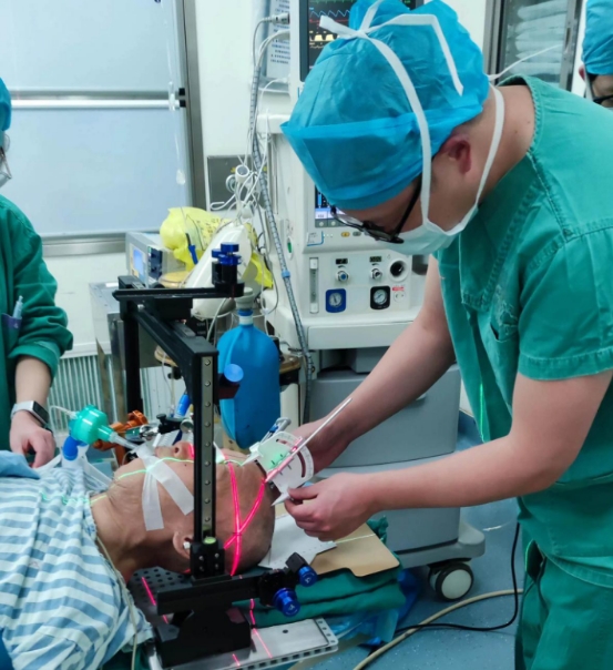 在征得家屬同意后,市中醫(yī)院神經(jīng)外科團(tuán)隊在謝勇主任的帶領(lǐng)下,經(jīng)過詳細(xì)分析,決定采用“激光精準(zhǔn)定位顱內(nèi)血腫穿刺抽吸外引流術(shù)”的微創(chuàng)手術(shù)方式來解決辜先生的問題。