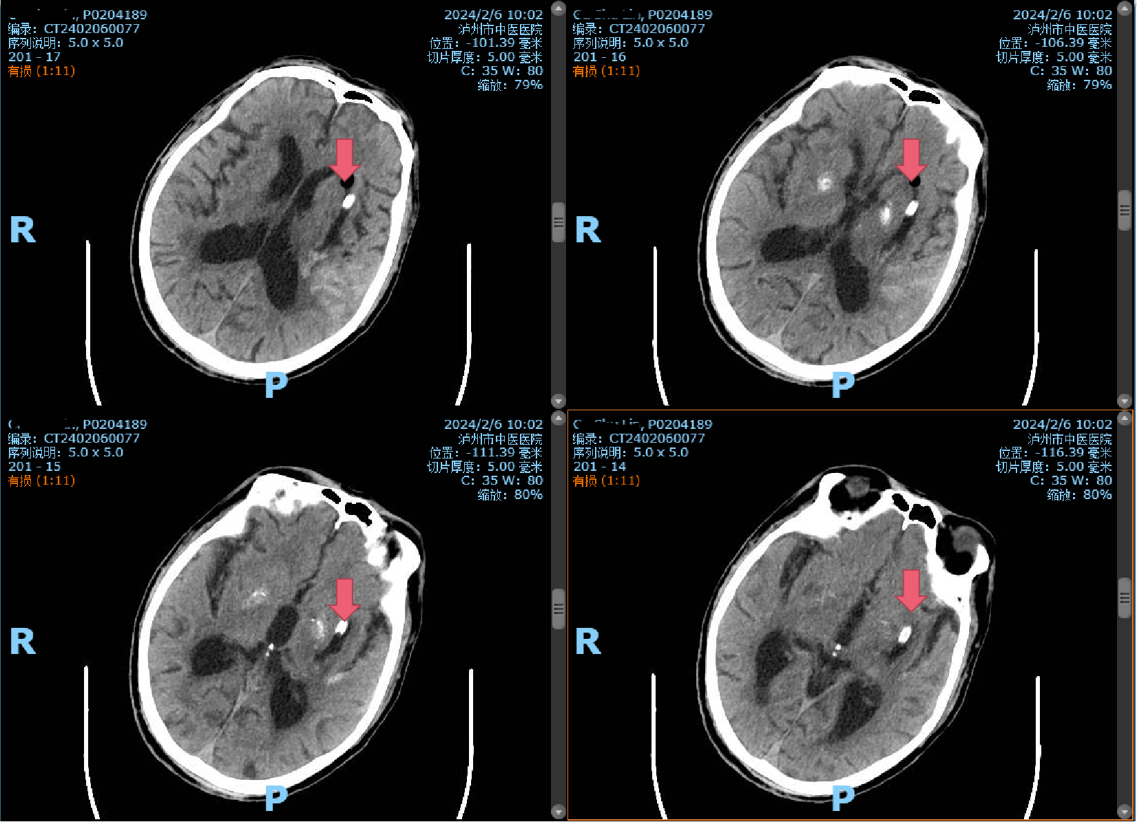 術(shù)后CT:左側(cè)基底節(jié)區(qū)腦出血伴血腫消失(紅色箭頭所指為引流管位置)