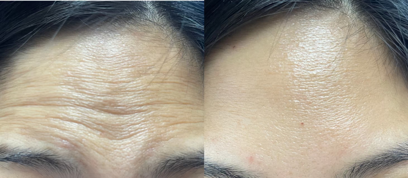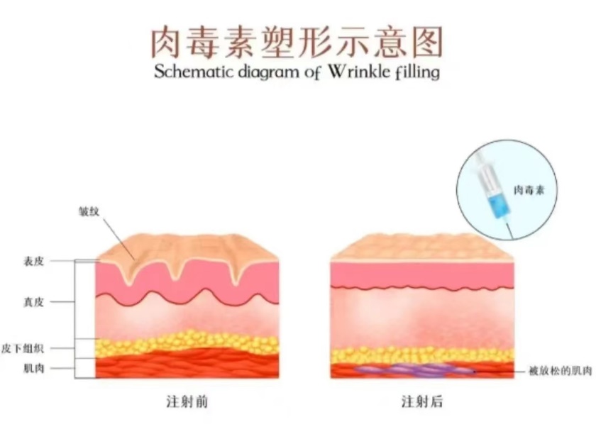 PS:通俗地說就是用“肉毒素”去麻痹緊繃的肌肉,肌肉放松了,皮膚自然就平整了。