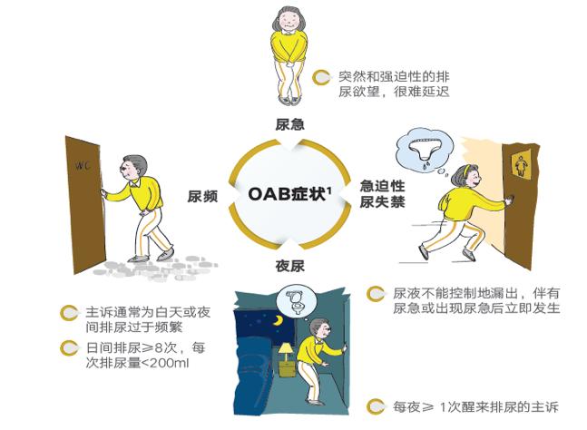 . 膀胱過度活動癥。又叫作OAB,一種以尿急癥為特征的癥候群,常伴有尿頻和夜尿癥狀,伴或不伴有急迫性尿失禁,沒有尿路感染或其他明確的病理改變。通俗地說,就是膀胱不受控制的過度活動,從而引起不停地上廁所,嚴(yán)重時甚至尿失禁。