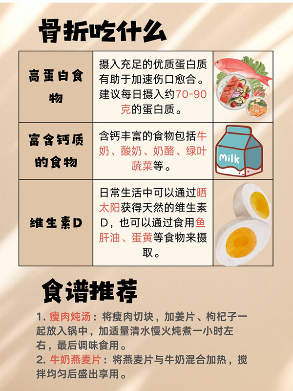 其實(shí),通常骨折后一般沒(méi)有太大的飲食禁忌,主要是不能吃一些辛辣刺激和生冷油膩的食物。以清淡易消化的食物為主,適當(dāng)喝一些骨頭湯,牛奶等補(bǔ)鈣的食物,可以促進(jìn)骨折處鈣鹽的沉積,加速骨折愈合。